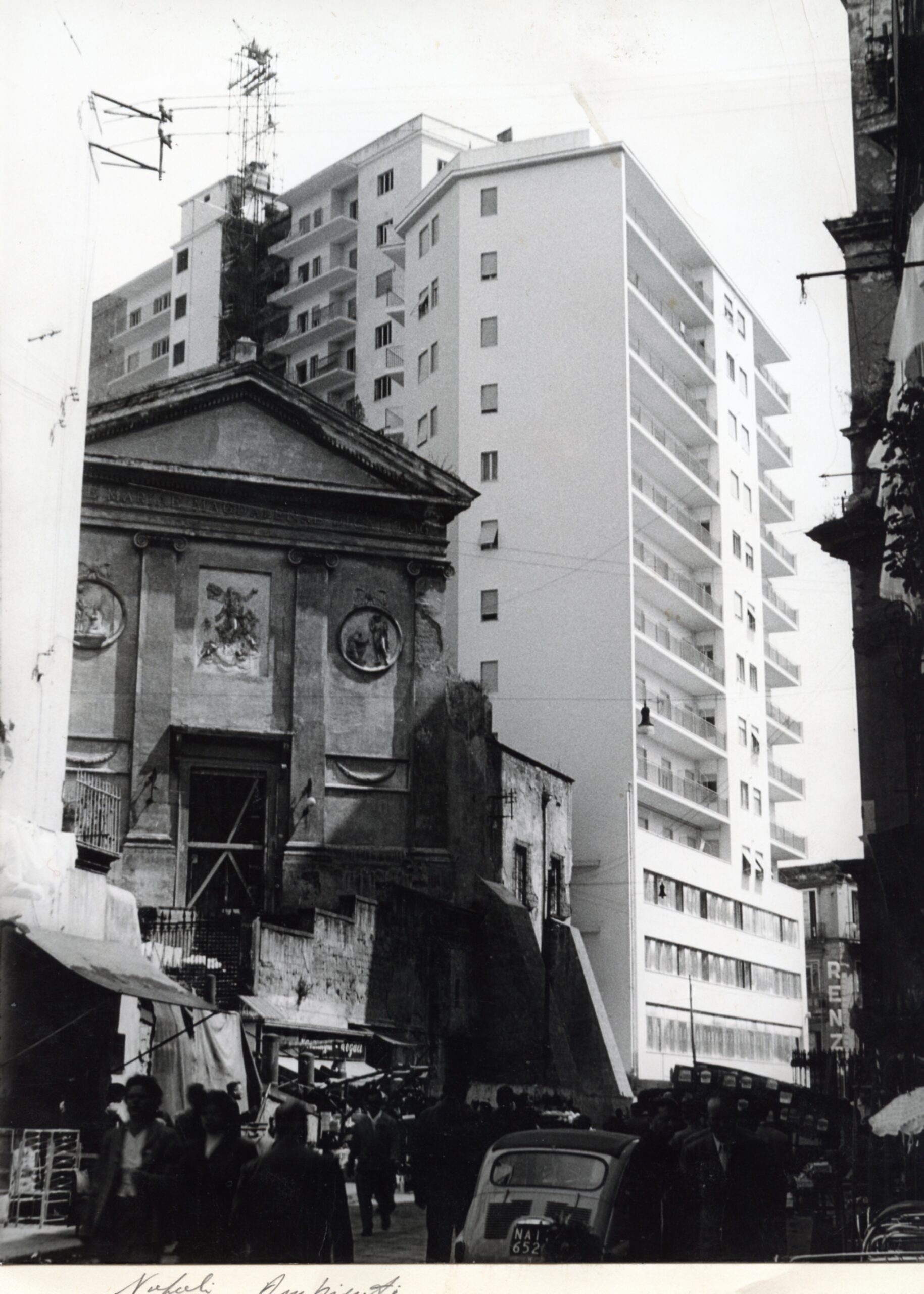 F.44): la bestiale ricostruzione intensiva di Napoli, in spregio a ogni norma igienica e urbanistica, ha creato una sorta di "mostro urbanistico. La differenza con Milano è che la chiesa della Maddalena, resa vacillante in seguito ai lavori di fondazione dei nuovi edifici, alla fine è stata demolita.