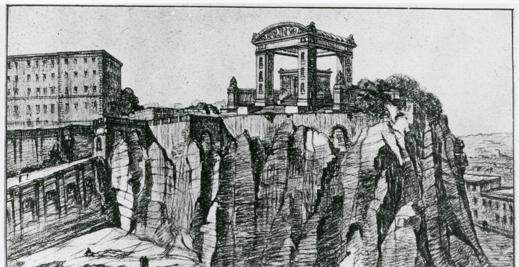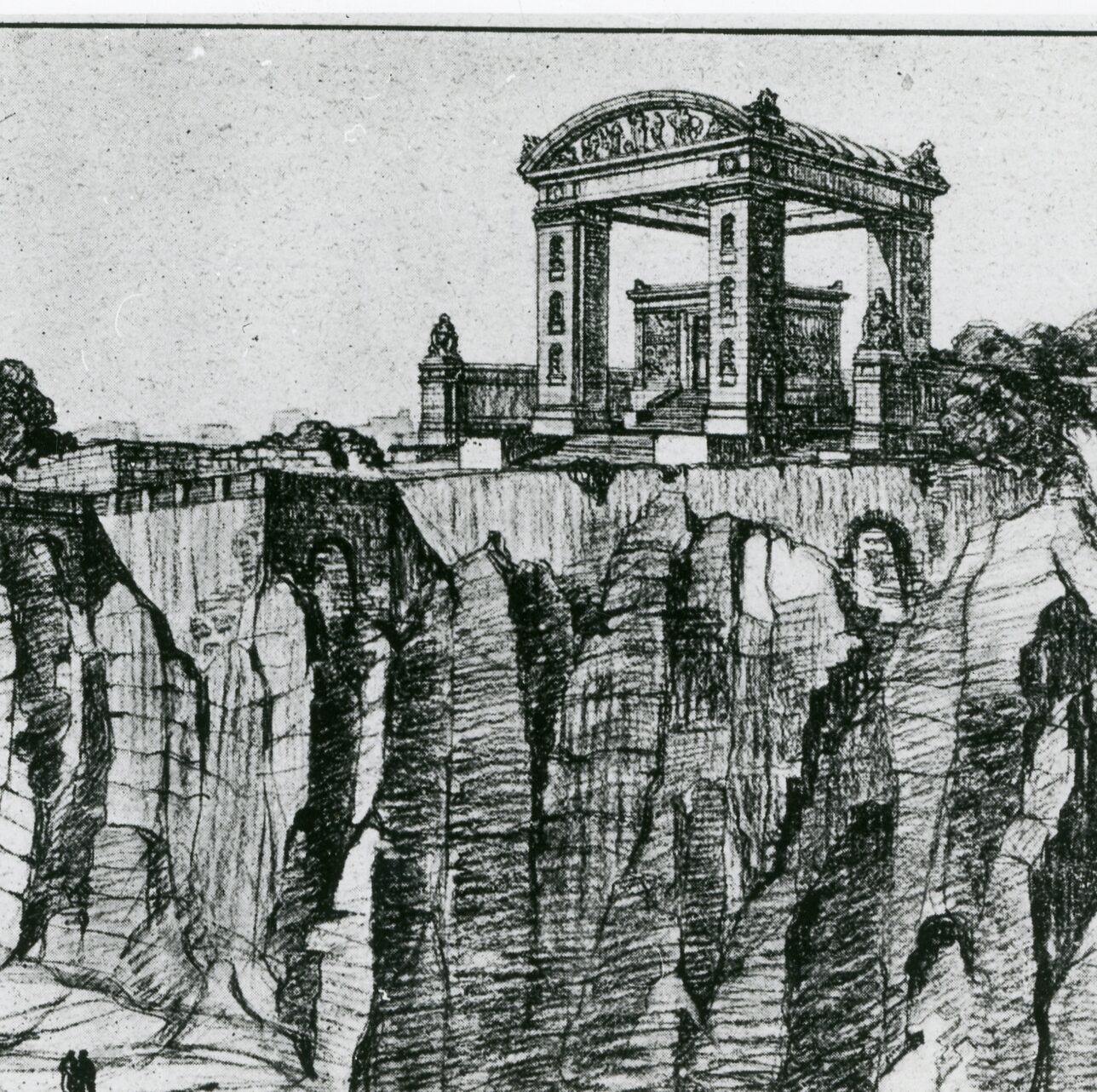 Si tratta dell'illustrazione n. 6 edita a pagina 85 del volume di A. Cederna, Mussolini Urbanista. Lo sventramento di Roma negli anni del consenso, Roma-Bari 1980, con la seguente didascalia: La fotografia è presente nel volume "Mussolini Urbanista. Lo sventramento di Roma negli anni del consenso" e riporta la seguente didascalia: "Progetto dell'arch. O. Frezzotti (quello che poi costruì Littoria) per il trasporto dell'Ara Pacis sul Campidoglio tutto raschiato, sotto una specie di baldacchino dorico-romanesco (da "Capitolium", 1925, p.71)."