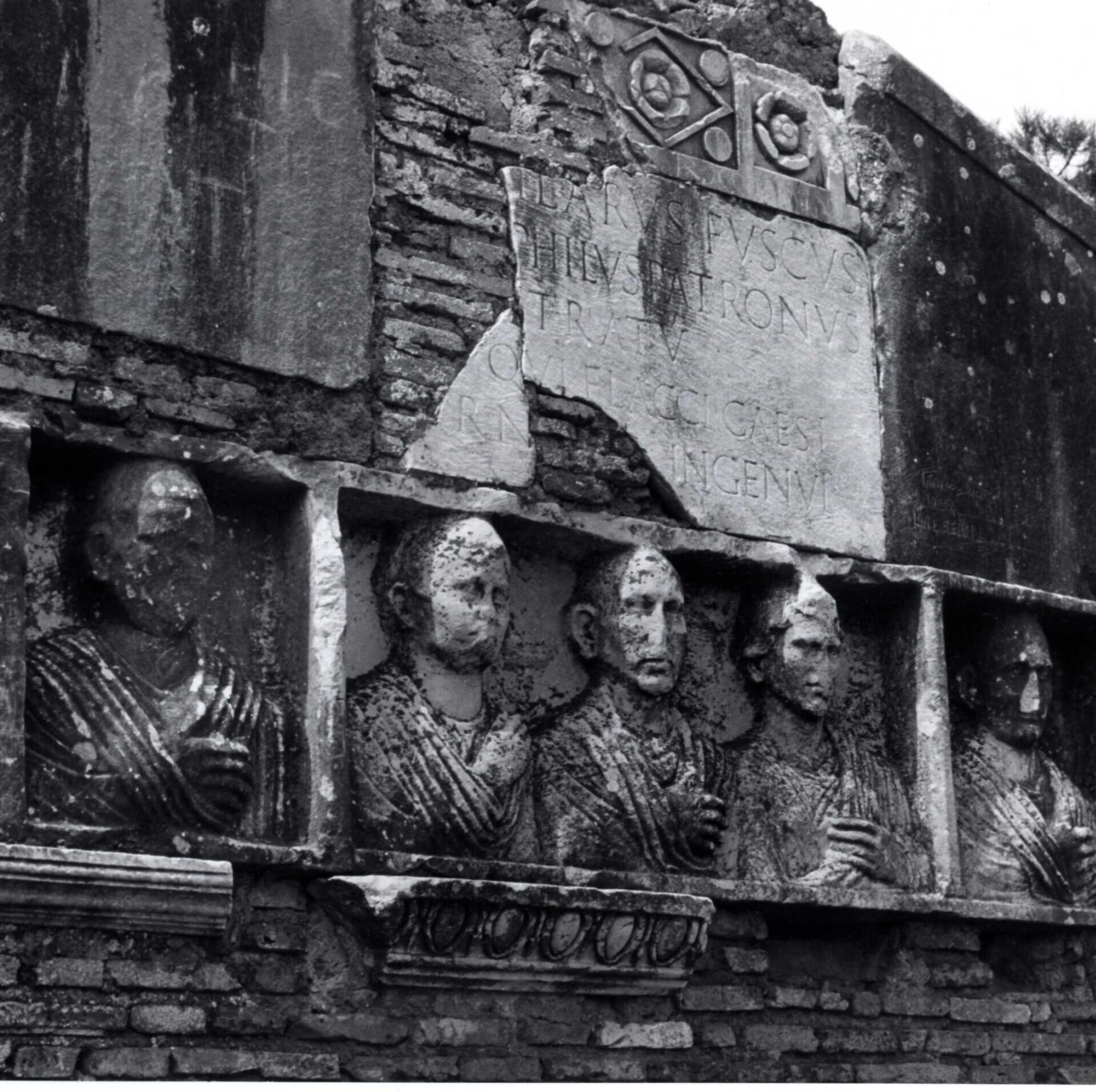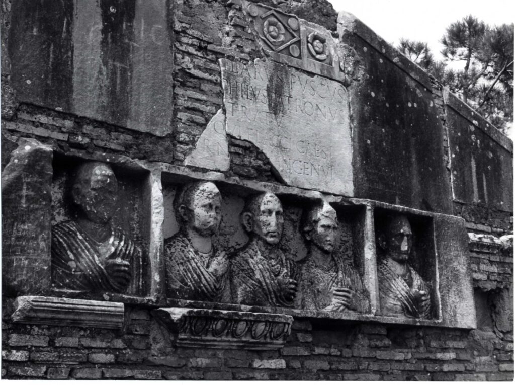 Fotografia che mostra il sepolcro di Hilaro Fusco, la cui facciata in mattoni fu costruita da Luigi Canina nella metà dell’Ottocento in corrispondenza dei resti di un monumento funerario, mentre il rilievo con i cinque ritratti è databile all'età Augustea.