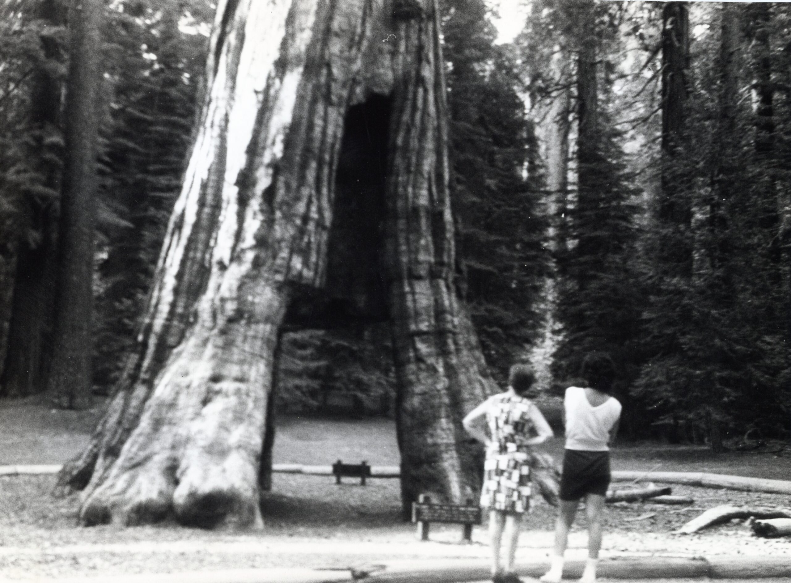 La fotografia mostra una monumentale sequoia che mostra una parte cava alla base. Forse la ripresa è stata realizzata nel Sequoia National Park